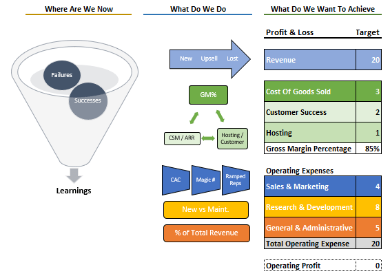 For example, when building top line growth targets in the financial plan, here are business questions samples that should be factored into the planning – Are there enough quota carrying sales reps to achieve the required new business to support the revenue growth? If not, how many new reps are needed to fill the gap, and how many months it will take for a new rep to contribute? Are there enough leads and pipeline to generate new business target? How many additional Customer Success reps are required to effectively manage the customer install base? Do you know the threshold of accounts one CS rep can manage, and at which point things will start to break? With all the investments in resources required to achieve the revenue target, how does that affect cash burn and runway?
