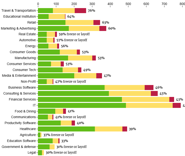 Not all industries are under duress during this pandemic. There are plenty of industries whose product is complimentary to the work-from-home environment such as e-commerce, logistics/delivery, video conferencing, and streaming. Site, Candor.co also provides the companies who are hiring. Leverage this data to seek the companies and industries who are thriving during this environment and who could benefit from your product or service.