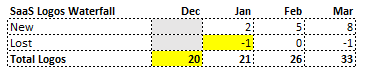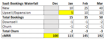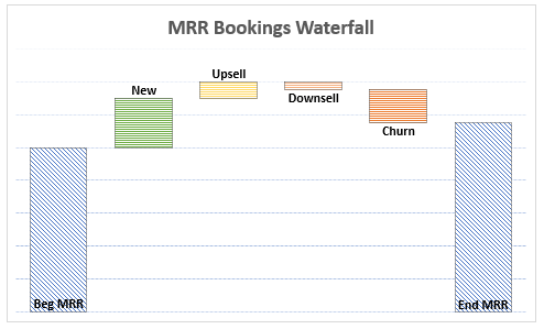 The SaaS Bookings Waterfall is the foundation for key SaaS Metrics. The waterfall is structured by recording monthly booked (contracted) revenue segmented by new, upsell/expansion, downsell, and churn, with the result being net revenue.