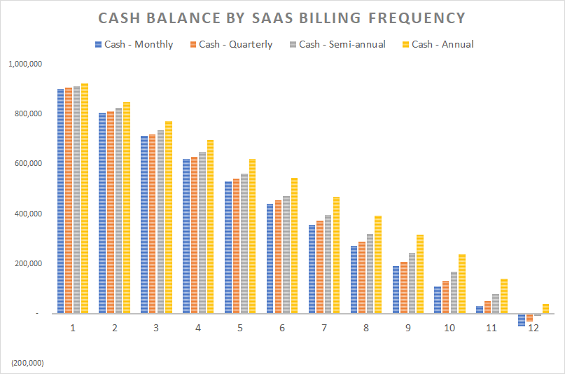 To further highlight the importance of annual upfront payments, consider the following early stage startup scenario below. The startup raises $1M of seed money, and generates 1 customer each month for $2K MRR over the course of the first year of operating. The gross burn is $100K per month. In the chart below, shows the cash position scenarios each month for monthly vs quarterly vs semi annual vs annual customer payments. For each payment type, only the annual payment scenario results with a positive cash balance. Even if you discount the MRR by 10 percent, which is common to motivate a customer to pay annual upfront, the positive cash balance remains. In this hypothetical scenario, the difference between annual and non annual payments can be startup life or death.