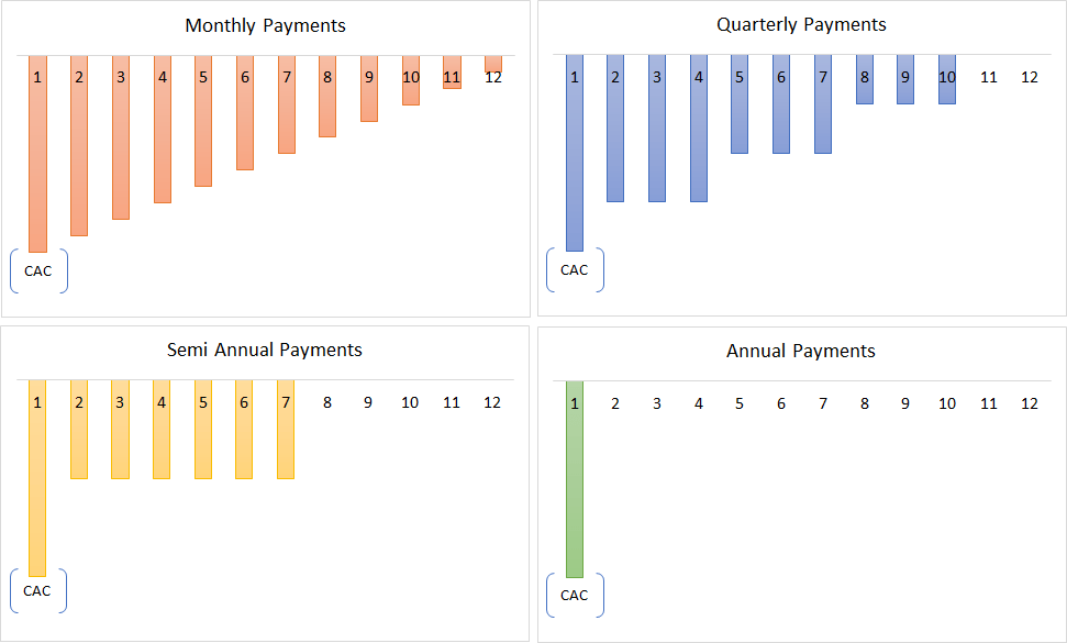 Below, depicts the cash flow payback period for a single customer on monthly vs quarterly vs semi annual vs annual billings. The initial customer acquisition cost in each chart is invested in period 1. The following periods shows the net result of the CAC investment subsequent to the customer repayments. The bars in the graph indicate how quickly the CAC investment is paid back to the business to generate positive cash flows. For example, the CAC investment is fully recovered in after month 12 from monthly payments, month 10 from quarterly payments, month 7 from semi annual payments, and month 1 from annual payments. The difference between monthly and annual payments is drastic. The time to recoup the CAC investment for monthly payments is one year where as for annual payments is in month 1. The lag time in customer payback is duration of the company’s capital that cannot be further invested back into the company to fuel growth.